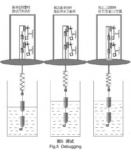 3)在調(diào)試過程中,發(fā)現(xiàn)液位開關(guān)沒有自保持功能,當(dāng)高報(bào)警點(diǎn)過后,液位再往上升則高液位報(bào)警會(huì)消除,低液位時(shí)也是同樣,在分析原因后發(fā)現(xiàn),鐵芯在套筒內(nèi)移動(dòng)的位置不當(dāng)是造成不能自保持的原因,如圖5所示,于是在套筒內(nèi)的鐵芯上方加一阻擋塊,使高液位超出時(shí),鐵芯被阻擋塊擋住,不再向上移動(dòng),從而不會(huì)脫出微動(dòng)開關(guān)的磁力范圍,對(duì)低液位報(bào)警的自保持是在鐵芯的下部加一個(gè)環(huán)型的墊片,阻止鐵芯向下移動(dòng)超出微動(dòng)開關(guān)的磁力范圍。從而提高了可靠性和重復(fù)性。接下來的調(diào)試中,又出現(xiàn)了一些零零碎碎的問題,如磁鐵磁性不夠,或者彈簧彈性不夠,彈簧的抗疲勞性差。元器件的材料和加工工藝不理想,出于對(duì)核電的安全性和穩(wěn)定性的考慮,開始考慮使用國(guó)外公司的產(chǎn)品,在試用后沒有出現(xiàn)以上的問題,于是決定從新采購(gòu)一批國(guó)外的液位開關(guān),將有問題的液位開關(guān)更換成國(guó)外的產(chǎn)品。