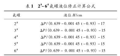 因液氨密度受溫度影響大,且每個氨罐的保溫效果也有差異,故如需準確測量氨罐液位,必須引入溫度測量。對2#~6#氨罐分別進行卸壓,并引入熱電偶遠傳至DCS系統,對密度進行修正,修正公式為Q液=0.639-0.00145t。經過以上修正,2#~6#氨罐液位修正計算公式如表1所示。