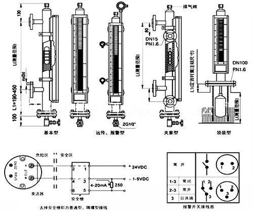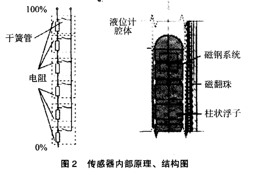 傳感器的作用是采樣液位高低位置并轉換成標準信號傳送至控制室,傳感器實際由干簧管和電阻組成。當浮子內磁鋼位置變化后,磁場通過器壁帶動傳感器內干簧管觸點吸合。干簧管吸合的位置決定回路的阻抗大小,干簧管的通常位置為10mm1組。回路的大小正好與液位的高低成正比,這樣*后由置于傳感器外殼內的變送器將電阻信號轉換成標準的電流信號,送至控制室。具體結構、原理圖見圖2。