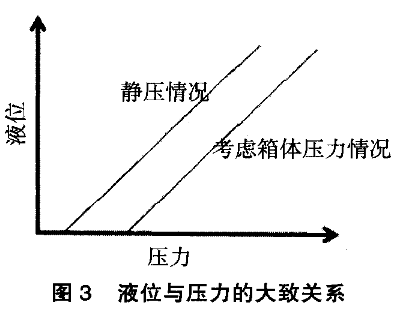針對設備的故障,技術人員采取了更換多種質量好的磁感應開關(如耐高溫型等),以及基于磁翻板的外貼式模擬量液位控制,但效果均不理想。其他液位測量(如超聲波等)造價較高,而且需要對設備進行相應的改造,并且停運一段時間,而該系統屬于公用,上述條件均無法滿足。既要實現自動控制,又要相應允許實施。技術人員再次結合系統圖進行了分析:該水位溢流處和下限處范圍還是比較寬裕,而且箱體為非承壓容器,所以箱體內的壓力和大氣壓相差不大,即便是有也基本上保持恒定,結合原水位測量的結構,考慮在海水液位計的液位測量筒下部加裝1臺壓力變送器,在箱體壓力不是很大且基本恒定的情況下,液位與壓力值基本成對應關系(只是在現場修正疊加一個常數值來消除箱體上不恒壓所帶來的偏差)。液位與壓力的關系曲線見圖3。