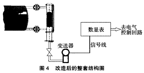 在外配1塊可輸出開關量接點的模擬量顯示儀表,這樣可實現液位的自動控制,集體的偏差多少可以在就實際進行整定試驗。整套測量系統的結構圖見圖4。