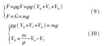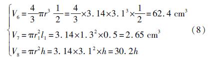 B類浮球為3節鈦合金圓筒型浮球,浮球質量為480g,浮球的總長度為25.5cm,磁性材料(即對磁翻板起作用的位置)在離直筒上端約2.8cm處。B類浮球的排水體積等于1個半球加上1個連接環再加上浸在水中直筒的體積,分別用V6、V7、V8表示,計算過程如下所示。