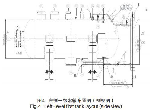 1)在每個疏水箱外部靠近水側(cè)取壓口處,安裝 3 個測量筒用于導(dǎo)波熱水箱液位計的安置以及液位測量;每個測量筒的汽側(cè)取壓口仍然選用原導(dǎo)波熱水箱液位計接口,而水側(cè)取壓口引用原水汽取樣口、磁翻板液位計取壓口,以左側(cè)一級水箱布置圖為例,見圖 4 左側(cè)一級水箱布置圖(側(cè)視圖)。