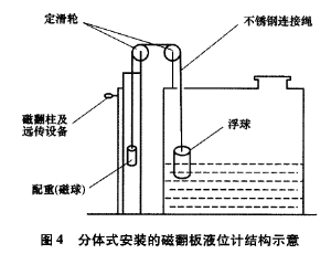 分體式襯四氟磁翻板液位計的安裝步驟如下:①通過計算浮力和配重,在槽體頂部合適位置安裝定滑輪,在槽外合適位子安裝磁翻板傳感裝置;②用直徑為3mm的不銹鋼繩連接浮子和配重,鋼繩長度根據液位來計算。這里特別要注意,磁翻板要反向安裝。