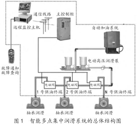 該智能多點集中潤滑系統由以下幾部分組成:電控系統、供脂系統、補脂系統、檢測及信號線路。智能多點集中潤滑系統總體結構圖如圖 1 所示