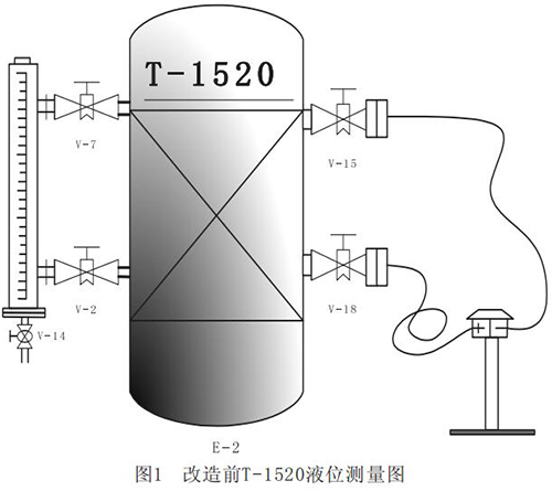 原T-1520液位測量為下圖1所示,左側(cè)為液化石油氣液位計(jì),右側(cè)為雙法蘭磁性浮子液位計(jì)。