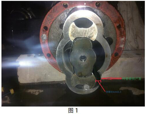 2015 年 8 月 10 日 17:50 機組在運行過程中“機組高位油箱事故低油位動作”事故停機。現(xiàn)場檢查發(fā)現(xiàn)機組高位油箱油位為 60mm,低于下限值 90mm。進一步檢查發(fā)現(xiàn),稀油站 2# 低壓油泵空轉(zhuǎn),沒有打油,振動、聲音較大。18:18 維護人員對 2# 低壓油泵進行了搶修拆解。發(fā)現(xiàn)油泵從動螺桿與襯套間隙過大,達(dá) 1cm 以上,襯套磨損嚴(yán)重(見圖 1)。油泵損壞,無法打油。