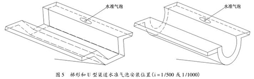 為便于直接確定渠道比降,定型斷面在工廠制作時,在渠道堤頂安裝水準氣泡,當水準氣泡居中時,設定的定型渠道斷面比降即為 1/500 或 1/1000時,不需再進行渠槽斷面參數的現場率定,通過量測定型斷面渠道水深,即可求得過水流量。圖 5 為設置水準氣泡的梯形渠道定型斷面和 U 型渠道定型斷面示意圖。