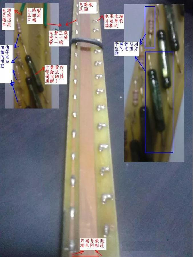 電阻測量電路板安裝在一個不銹鋼的護套管內,電路板由相同阻值的電阻串聯而成,每個電阻的末端與電路板電源進線間并聯一個干簧管,干簧管內部有一個對磁性敏感的小觸點,遇到磁浮子的磁性時觸點吸合,此干簧管以下的所有電阻被短路,電路板的電阻值變小使變送器輸出電流變大。磁浮子上升或下降后干簧管的觸點在釋放,此點的電阻恢復功能。