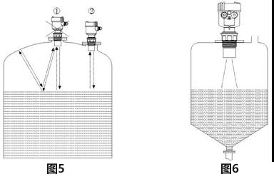 5、對于頂部為拱形的容器,超聲波液位計安裝應偏離容器頂中心位置,以免形成多次的反射回波,如圖5所示。