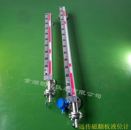 液位計根據浮力原理,浮子在測量管內隨液位的升降而上下移動,浮子內的永久磁鋼通過磁耦合作用,驅動紅、白色翻柱翻轉180’液位上升時,翻柱由白色轉為紅色,下降時,翻柱由紅色轉為白色,從而實現液位的指示。