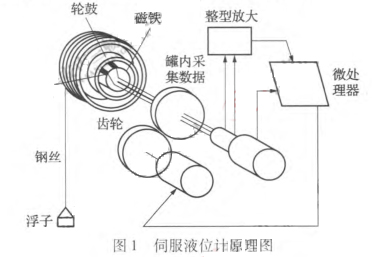 伺服液位計具有智能性、高精度等優點。從前文的分類角度而言,伺服液位計屬于接觸式、力學原理類的智能液位計。它的工作原理是基于浮力平衡原理,由微型伺服電機連接細鋼絲驅動體積較小的浮子,形成一個閉環反饋系統,如圖1所示。當液位計工作時,浮子自身產生的重力作用于細鋼絲上,在外輪鼓產生力矩,從而引起磁通量的變化,磁通量的變化將導致電磁傳感器的輸出電壓信號發生變化。將電壓值與存儲于CPU中的參考電壓進行比較,當達到浮力平衡時,電壓差值為零。此時測量纏繞在輪鼓上細鋼絲所經歷的長度變化,得出液位變化情況,由于輪鼓對鋼絲的測量分辨率很小,從而使得伺服液位計能夠達到±1mm左右的精確度。