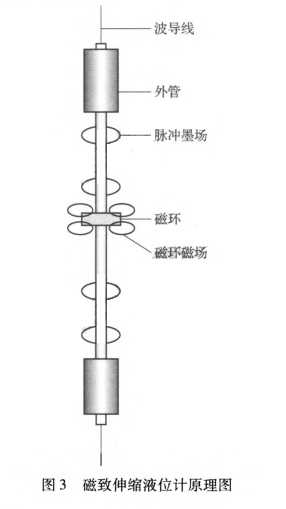 磁致伸縮液位計是根據磁致伸縮原理進行工作的液位計,具體工作原理:在非磁性的波導管內安裝一根磁致波導線,波導管外部安裝有隨液面進行上下運動的磁性浮子,在磁致波導線的其中一端裝有壓磁傳感器,傳感器在每個時間單位發出一定數量的電流脈沖信號,此信號沿著磁致波導線向下傳送,從而產生一個向下運動的磁環磁場,該磁環磁場同磁性浮子的磁場相互作用,從而產生一個脈沖磁場,脈沖以已知速度沿磁致波導線運動,并被壓磁傳感器接收,通過計算起始電流脈沖和返回脈沖的時間間隔得出浮子的位置,如圖3所示。