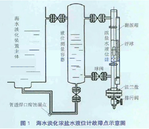 2013年12月16日0:20海淡水化裝置主體U3濃鹽水液位計開始出現30%~70%的波動,檢查液位計本體無異常,將液位計上、下閥門關小后,液位測量波動減小,但故障現象并未消失。利用高爐休風機會降海水淡化U3主體負荷并查找故障原因。將液位計上、下閥門全關閉并拆下下部絲堵,打開排污閥徹底進行排氣排污處理,檢測磁性浮子,未發現異常。當投運后波動現象存在。濃鹽水液位計更換后再次試投運,發現液位計液位顯示波動更大、更頻繁。經過排查發現與液位測量容器(見圖1)連接的管道焊接處有漏點,對該漏點進行封堵后液位測量顯示恢復穩定,負荷狀態生產恢復正常。